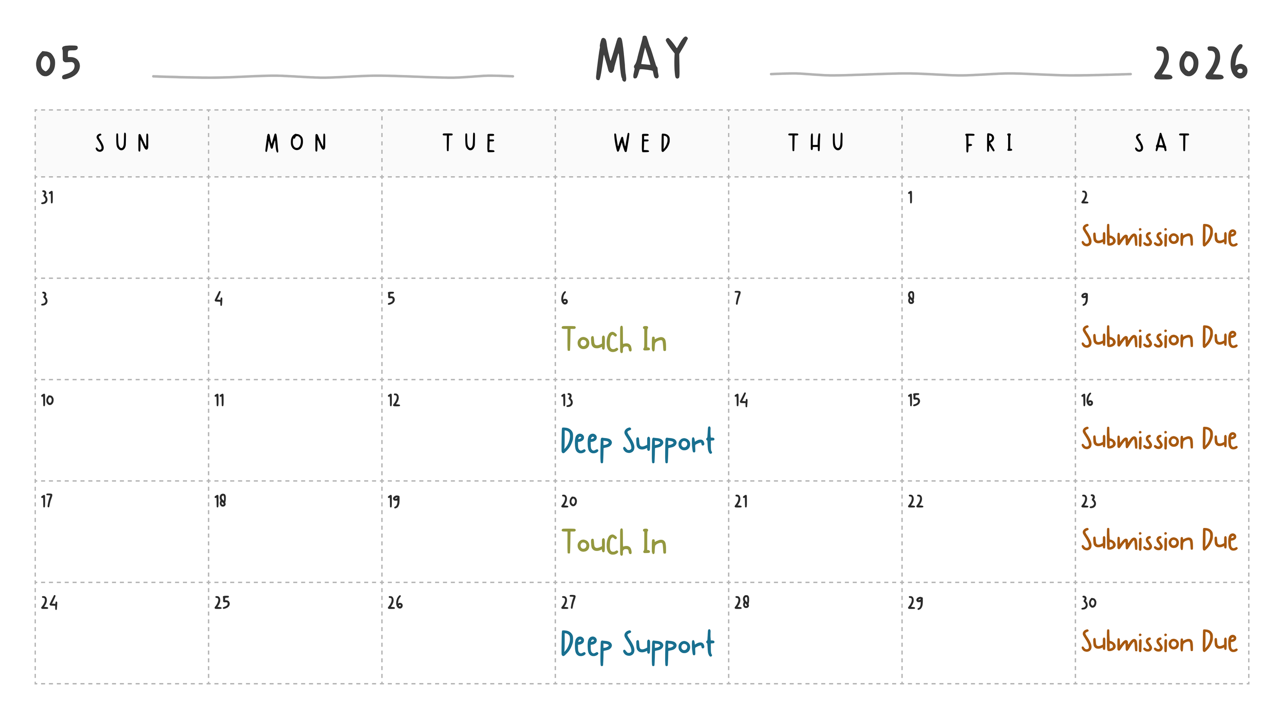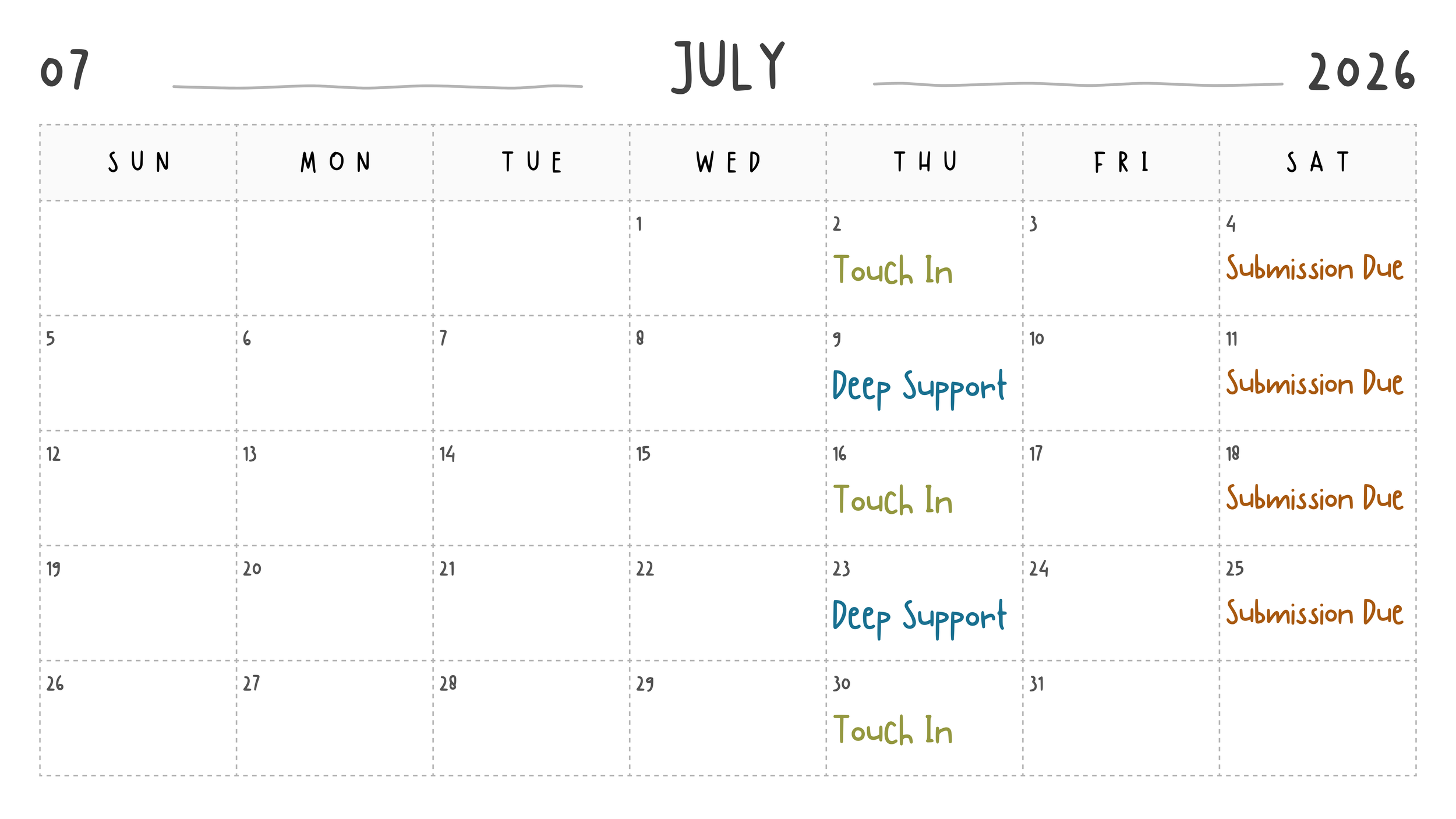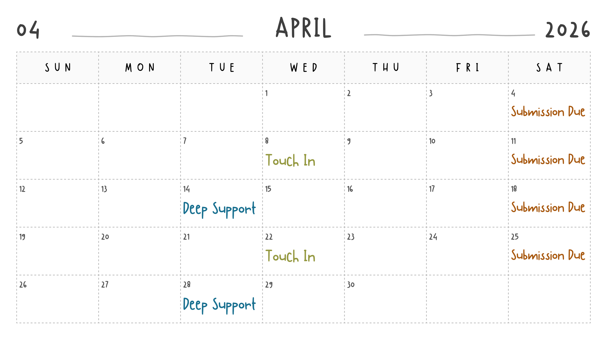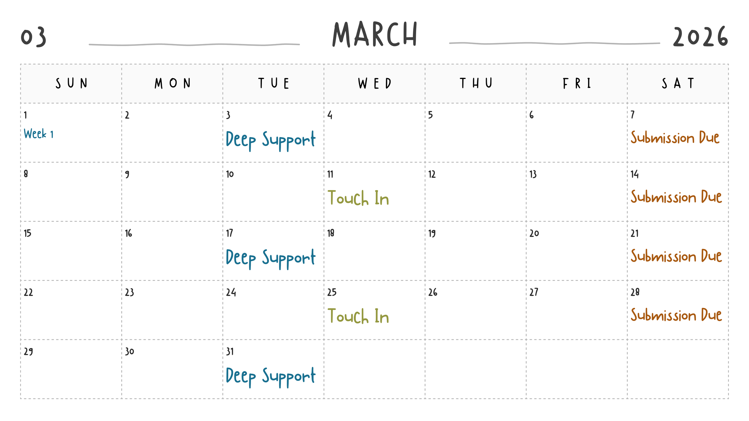 Step 3 — Weekly support (March 1 → late August)